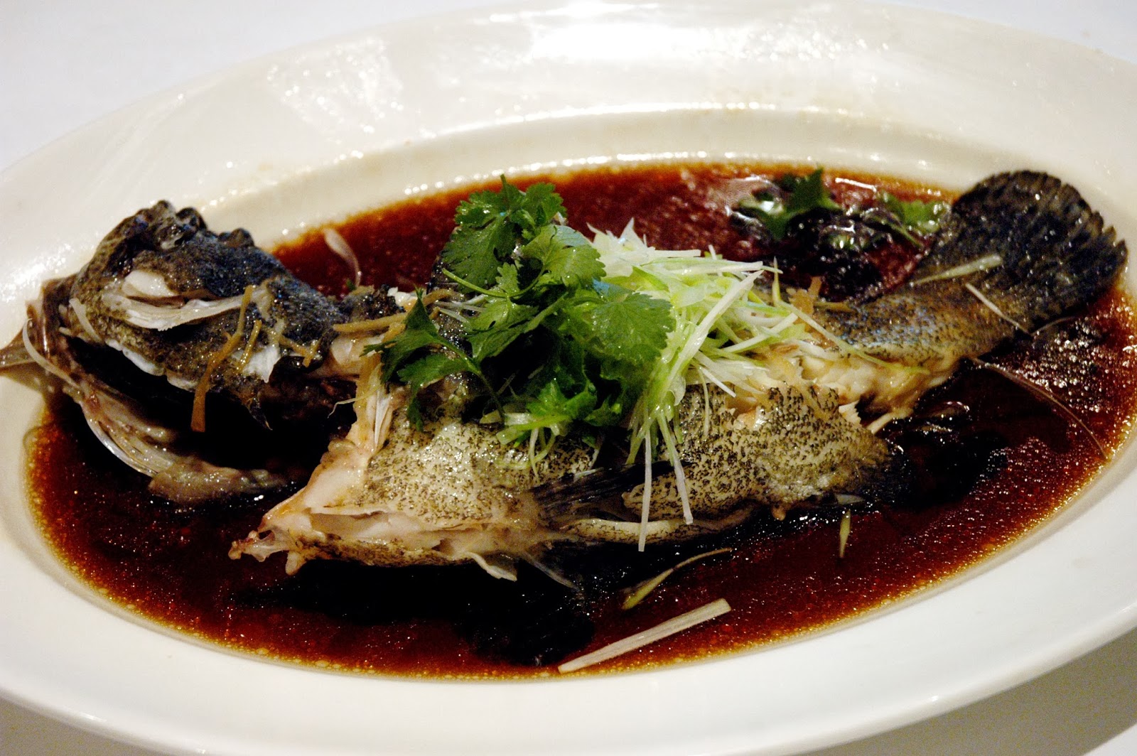 Steamed Lapu-Lapu Hong Kong Stle in Light Soya Sauce, comforting and familiar, topped with fresh scallions and ginger. The delicately steamed fresh grouper has a fresh and subtle sweetness, while the loght soy sauce simply enhances the flavor without overpowering the fish.