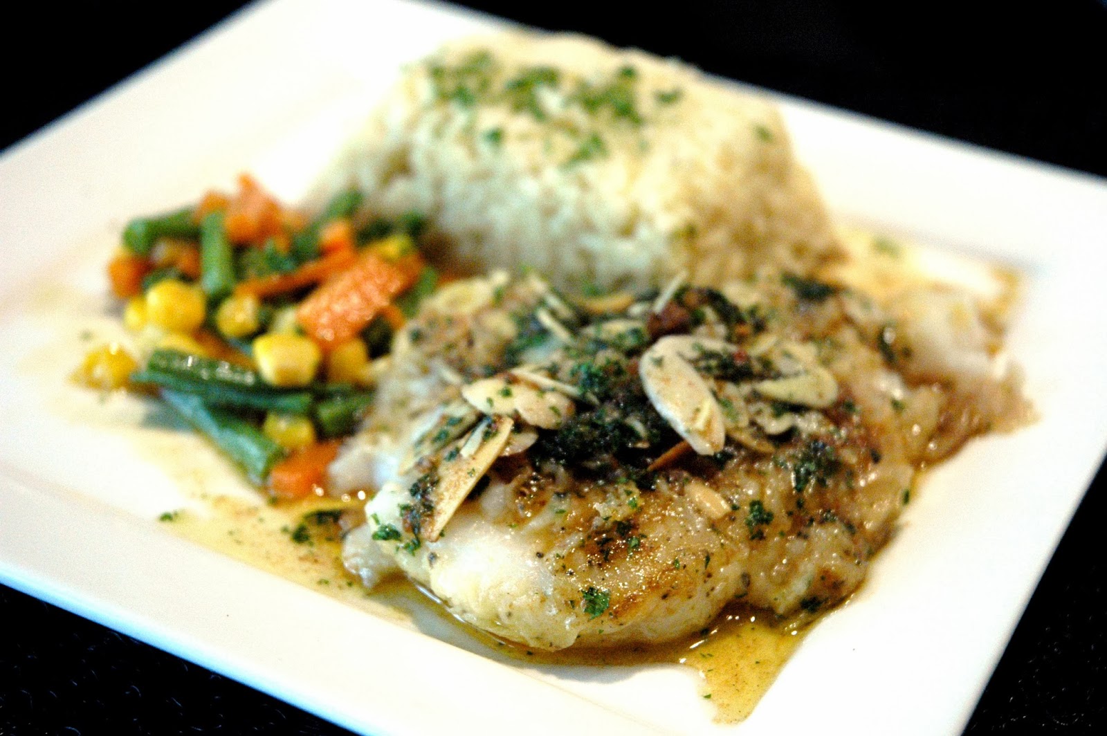 Fish Almondine (P 360), creamy fish fillet topped with almonds in a richly flavored almond butter sauce. Served with rice and vegetables, the rich butter and almonds bind this dish with its rich flavors.