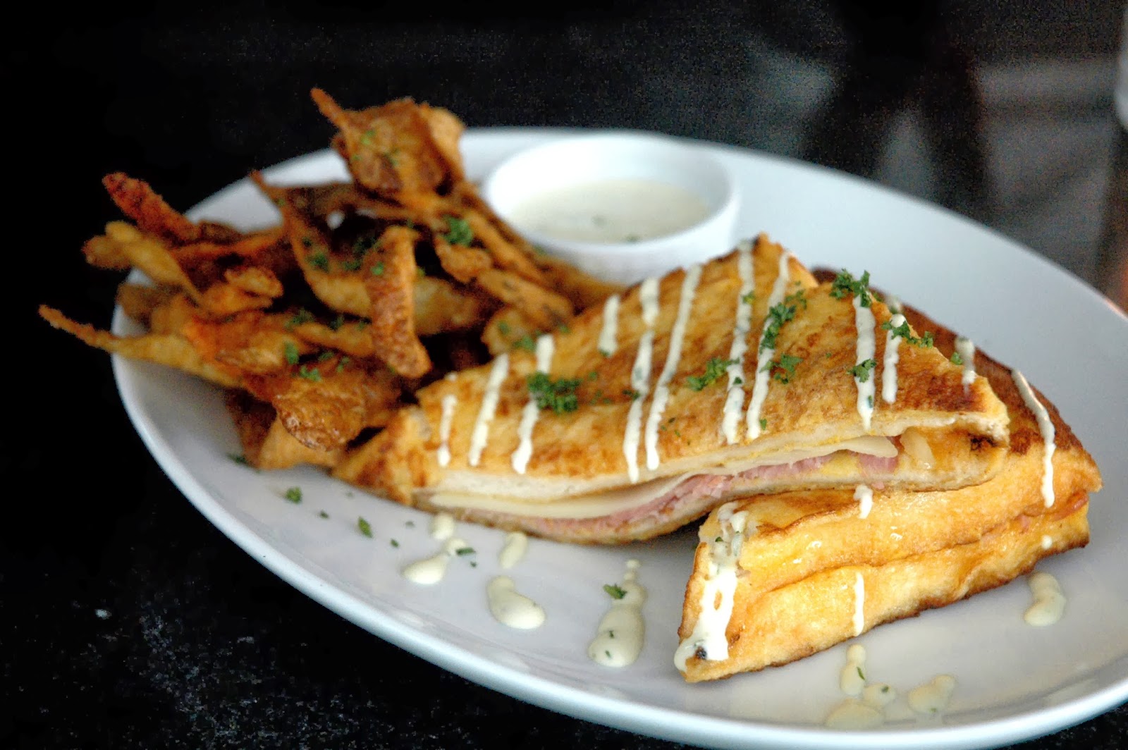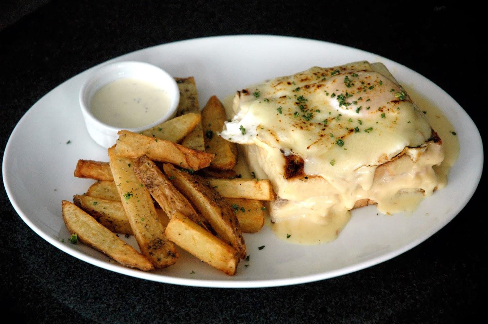 Speakeasy also offers a rich Croque Madame (P 315), Farmer's ham and Gruyere cheese topped with a sunny-side up and even more Gruyere cheese on white bread, served with thick, fresh-cut fries.