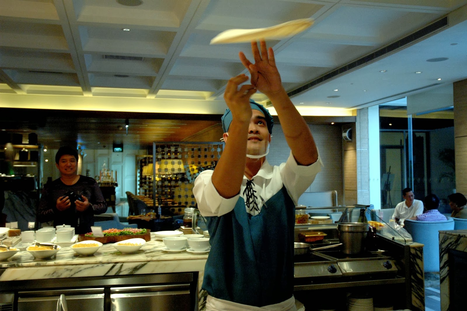 At Cafe Ilang-Ilang's Pizza Station, the chefs prepared their signature Pizza Manila Hotel, freshly prepared and hand-tossed pizza dough topped with mozzarella, kesong puti (a local white cheese made from carabao's milk), chorizo, and black olives, baked in a traditional brick oven.