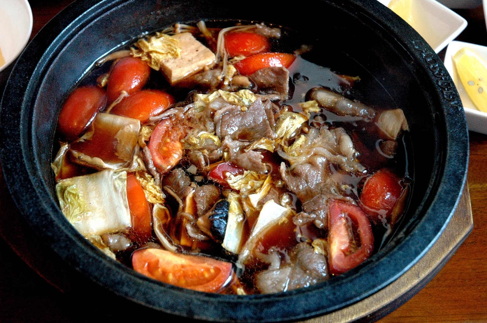 Then, the first of the main courses arrived, starting with the Japanese Wagyu Sirloin Tomato Sukiyaki, proudly presented and cooked by your tableside. Just one look at the vibrant colors and marbling of the Wagyu Sirloin tells you this is no ordinary beef.