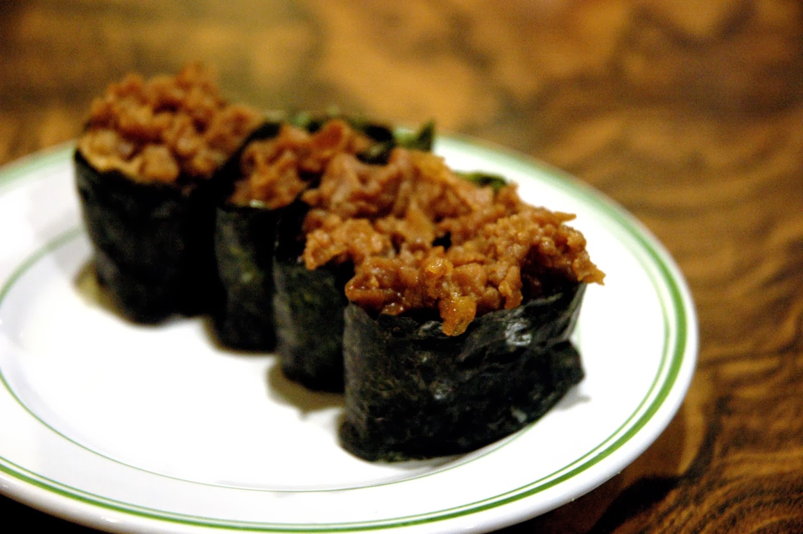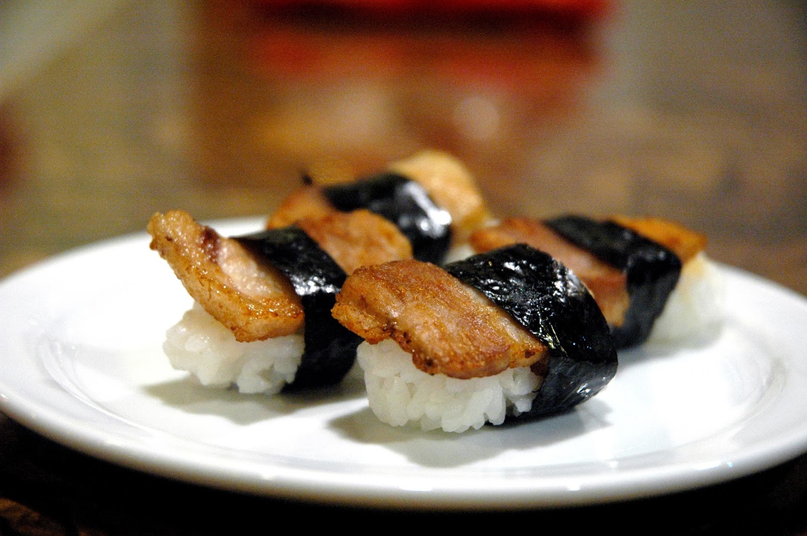 Then, there's the Spam Sushi, with tender strips of Spam lightly caramelized with a torch, on rice and wrapped in Nori. Spam, on a rice roll and nori...perfect.