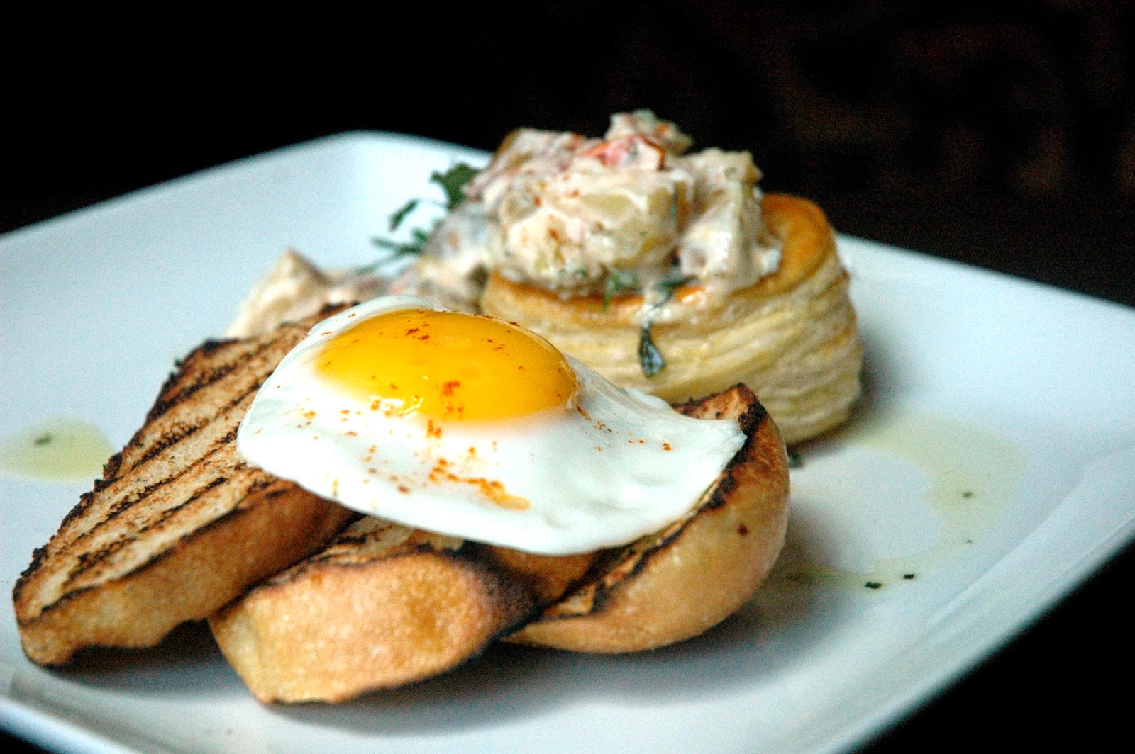 Pancetta & Sundried Tomato, puff pastry basket filled with a poached egg topped with tart sundried tomatoes and a rich and flavorful pancetta hollandaise. The bold flavors of the smoky and salty pancetta and sundried tomatoes are balanced by the creamy hollandaise sauce and poached egg for another hearty and comforting blend of flavors.