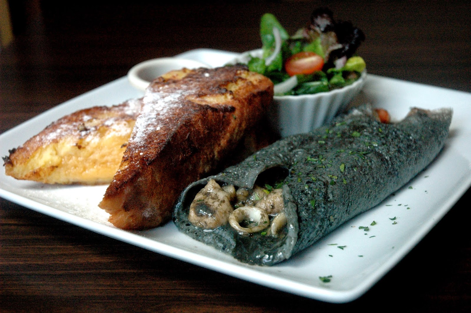 The Hearty Seafood Omelette, a delicious and comforting blend of cream dory and fresh calamari mixed with red and green bell peppers delicately wrapped in a squid ink omelette. A savory omelette unlike any other, the unique squid-ink flavor makes this omelette dish stand out from the usual, with a totally distinct flavor profile. Chef Josh Boutwood pushes the envelope once more with this unique and savory dish. Paired with baked French toast lightly dusted with sugar and a side of maple syrup, one can enjoy a wide range of flavors in just one dish.