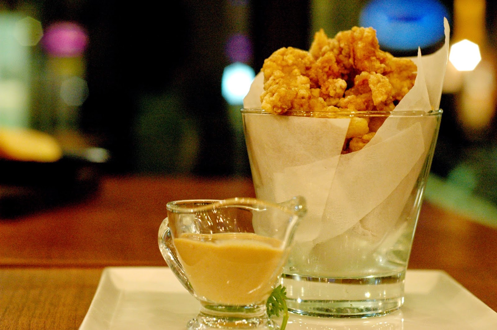 Yakuza Chicken (P 295), Japanese-style marinated and crunchy chicken fillets served with katsu sauce. Crispy breaded chicken with a creamy sauce injects familiar flavors in the mix of appetizers at Mesclun.