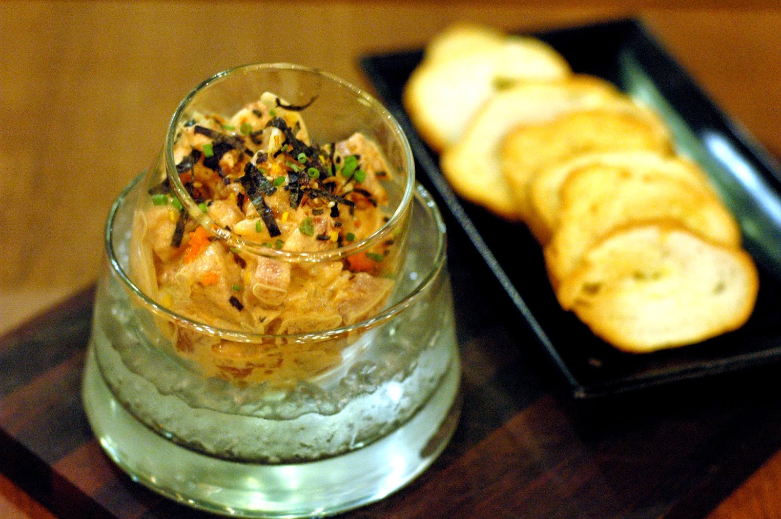 Andre's Poke (P 345), a fresh and flavorful tuna ceviche with rich soy sesame dressing and spicy Sriracha mayo, served with crispy crostini. Fresh, clean flavors and the blend of spicy and creamy notes add contrasting yet balanced flavors.