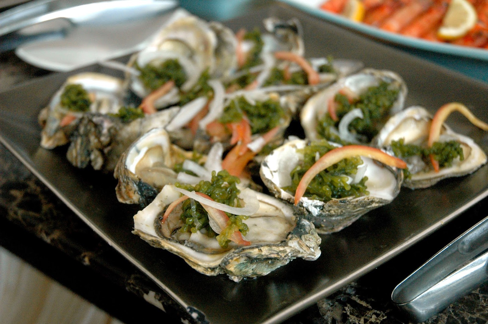 Regional variations of Kinilaw (L), the local version of Ceviche, with the freshest tuna and seafood in a variety of spice blends, greet diners at the Seafood Station, along with a variety of fresh oysters on ice.