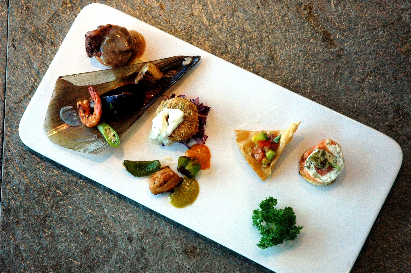 Next, we sample a variety of American cold appetizers including (from lower right) Pinwheel Alaskan Homemade Smoked Salmon with Cream Cheese Filling, Guacamole Salad on a crisp tortilla, Portland Mini-Fish Cake with creamy garlic aioli on Orlando Red Cabbage Coleslaw, and Penne Salad with Beetroot Sour Cream Dressing. The diversity of distinctly American flavors are elegantly presented in bite-sized sampler portions, each representing the culinary style of America's regional flavors.
