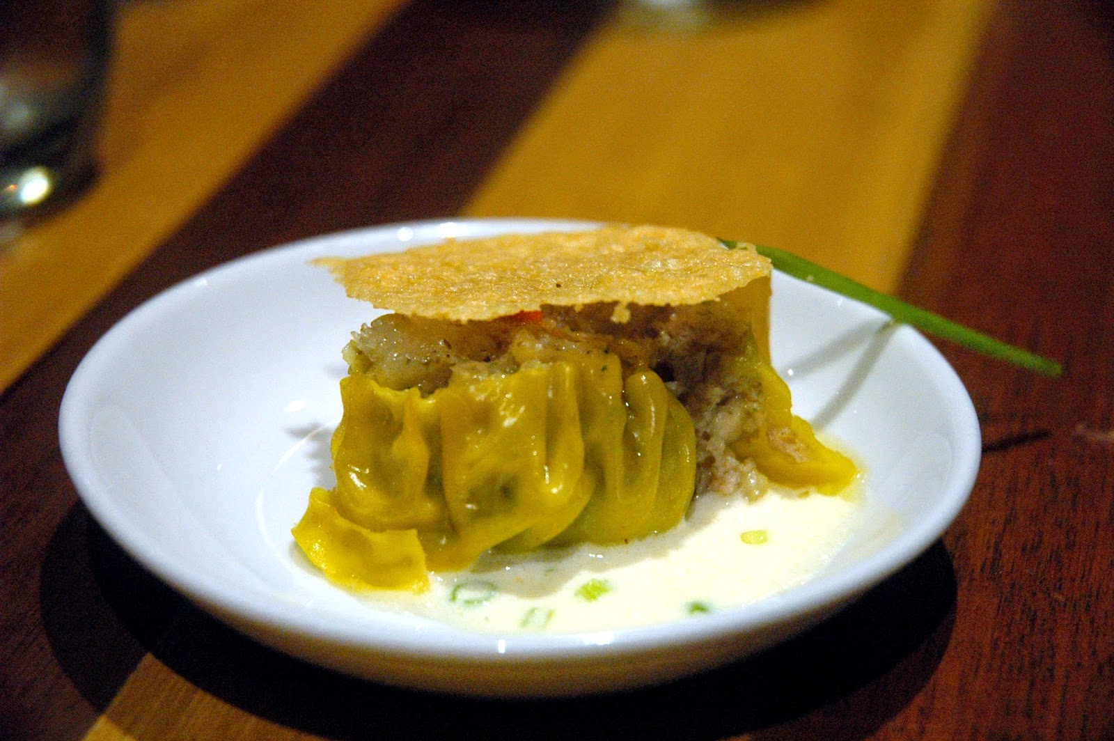 Truffle Cheese Veal Dumpling, a light starter combining the rich flavors of finely minced veal with the sharp notes of a baked cheese crust on a delicately steamed dimsum. The contrasting flavors reflect that east-west fusion, and this is just the first course.