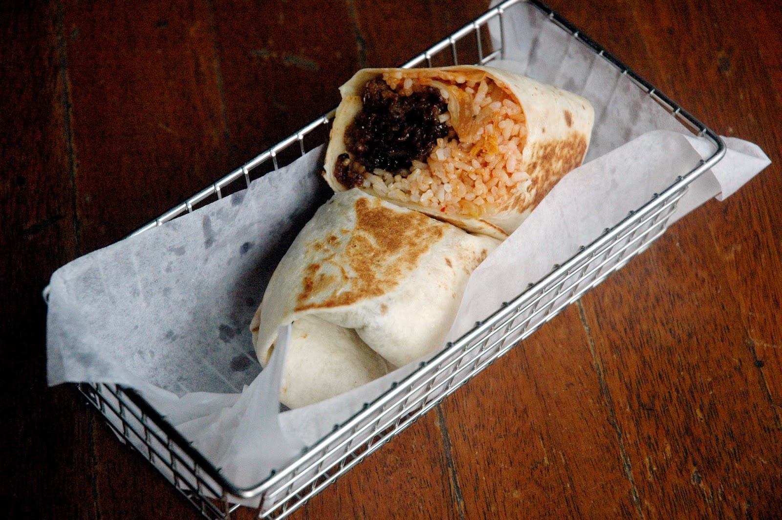 OTG's The Korean (P 245), definitely not your usual burrito, this one packs some serious heat, with juicy, tender shredded Korean bulgogi beef and tangy sliced kimchi bended with the richly seasoned OTG Rice in a 10" Mexican style burrito wrap. Kimchi and beef bulgogi in a burrito. Absolute genius.