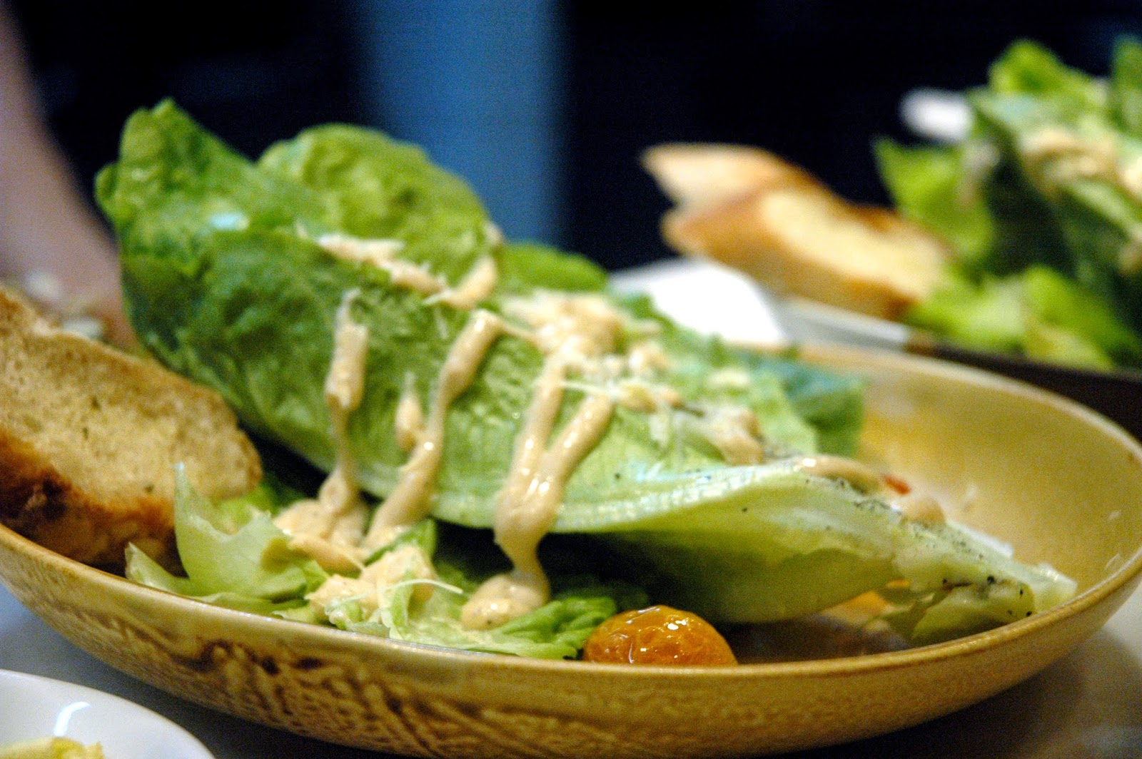 Caesar Salad (P 225), char-grilled romaine lettuce and oven-roasted cherry tomatoes dressed with a rich Caesar dressing made even richer with roasted garlic, topped with queso de bola shavings. The garlicky dressing and sharp notes from the queso de bola combine for rich flavors, giving this salad a real kick.