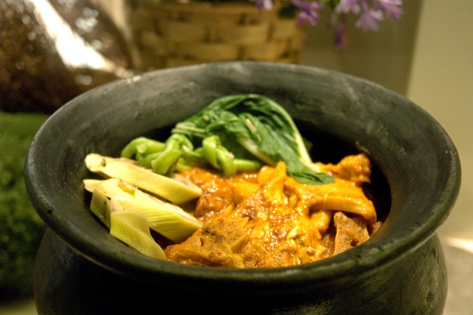 Law-Uy, a Visayan vegetable soup with with fresh cucumbers, tomatoes, taro, and malunggay leaves in a light, clear broth is served next. The clear broth and vegetables make this dish look deceptively simple, but each sip of the flavorful broth and the snap of the crisp vegetables make this dish special. Subtle, delicate flavors in a light soup dish, and you're just about ready for the next course.