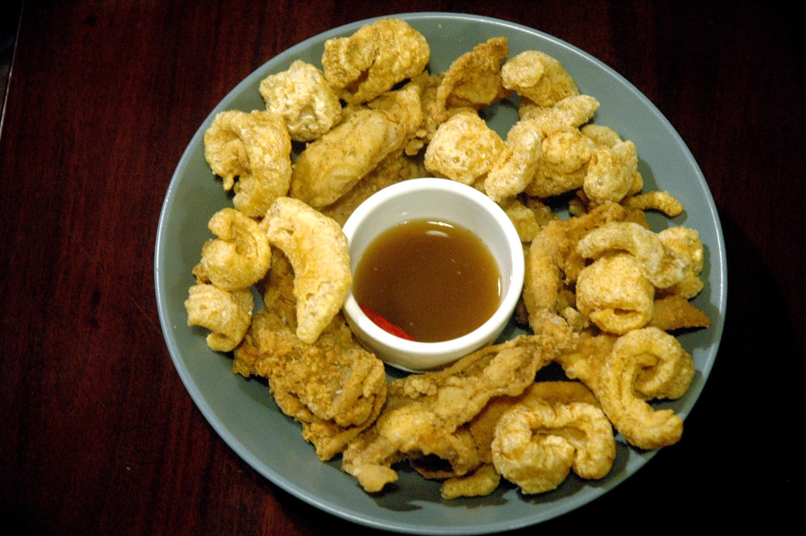...starting with the Killer Chicharones (P 195), a crisp medley of crunchy hog skin, chicken tail poppers, and skin served with spiced vinegar and spiced ketchup. Chicken skin and pork cracklings in one plate...just doesn't get any better than that. Make that another round of Whiskey Sour...