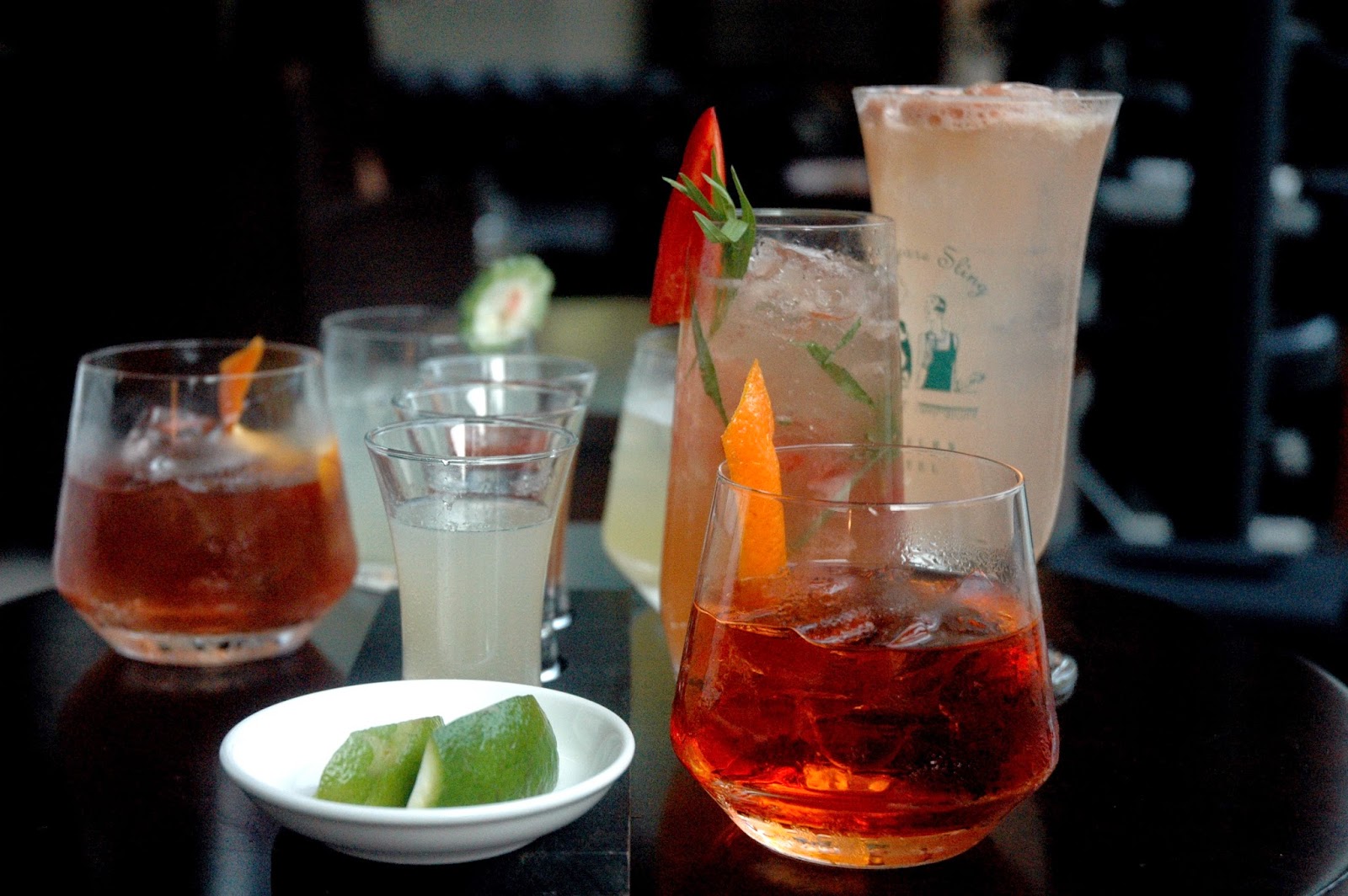 Long Bar's creativity and inventiveness is highlighted in yet another line of new cocktails. In a creative collaboration with Rustan's, Long Bar unveiled its newest line of cocktails, Rustan's Couture Cocktails, with each drink inspired by Rustan's brands. The new cocktails include (from top, left to right) the colorful Pink Champagne, inspired by Monique Lhuillier, with Aperol, cherry blossom syrup, cranberry juice, and champagne; the Red Fox, inspired by Thomas Pink, with Bombay Sapphire, tripper pepper mix, tomato juice, and fresh lime; the Oriental Bubby, inspired by Natori, with Belvedere Vodka, lemon, pineapple, ginger, cayenne pepper, and champagne; the Lady Daiquiri, inspired by Lady Rustan, with Don Papa Rum, Grand Marnier, earl grey tea, lemon, and mint; the London Bourbon, inspired by Hackett, with Maker's Mark Bourbon, aperol, Martini Rosso, and panutsa syrup; the Boho Martini, inspired by Patis Pamintuan Tesoro for Rustan's, with Bombay Sapphire, peach schnapps, blue curacao, and calamansi lemonade; and the B&B (foreground), inspired by Faconnable, a simple yet bold blend of premium brandy, benedictine, and pastis. Each one distinct with its own unique flavors, clearly capturing the essence and personality of each brand by Rustan's. Available only for a limited time, catch it while you can at Long Bar.