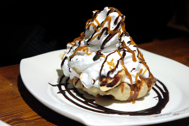 Liege Waffle with Caramel Banana Cream Topping (P 145), with fresh banana slices topped with whipped cream, drizzled with chocolate and caramel syrup. The sweet and creamy topping with the lightly crisp and chewy Liege Wafflesmake for one cool combo, and great when paired with Caffe Bene's medium roast Americano.