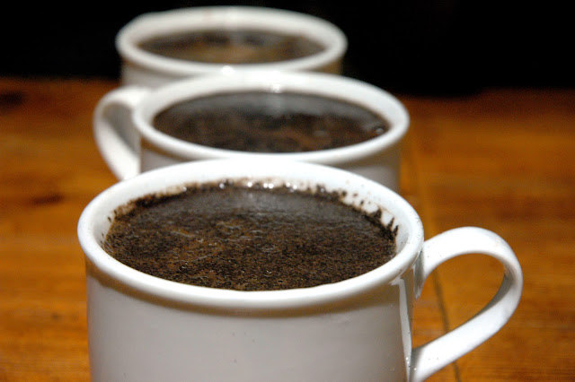 ...and after "breaking" the process by skimming a spoon, the cups were ready. The aroma of the medium roast espresso has a subtle, almost fruity note, as opposed to the the strong, almost burnt rubber-like aroma of the other blends. With a spoon, we sampled the different cups, and just like the aroma, the medium roast seemed to have a richer, rounder and sweeter flavor versus the overwhelmingly bitter notes of the other dark roast blends. And that's the "Bene Difference."