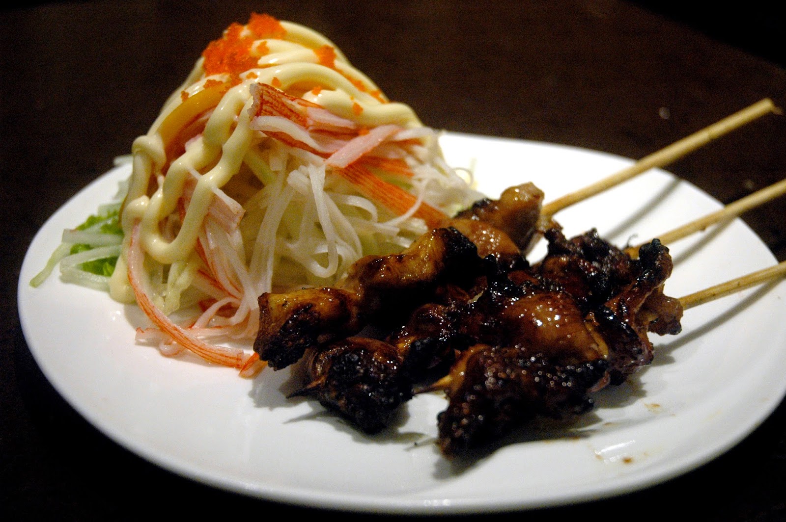 From the Yakitori Station, skewers of teriyaki glazed chicken skin, chicken liver, and pork belly fresh off the grill, plated with a side of refreshing Kani Salad drizzled with Japanese mayo. The smoky hints and sweetness of the glaze complete the flavors.
