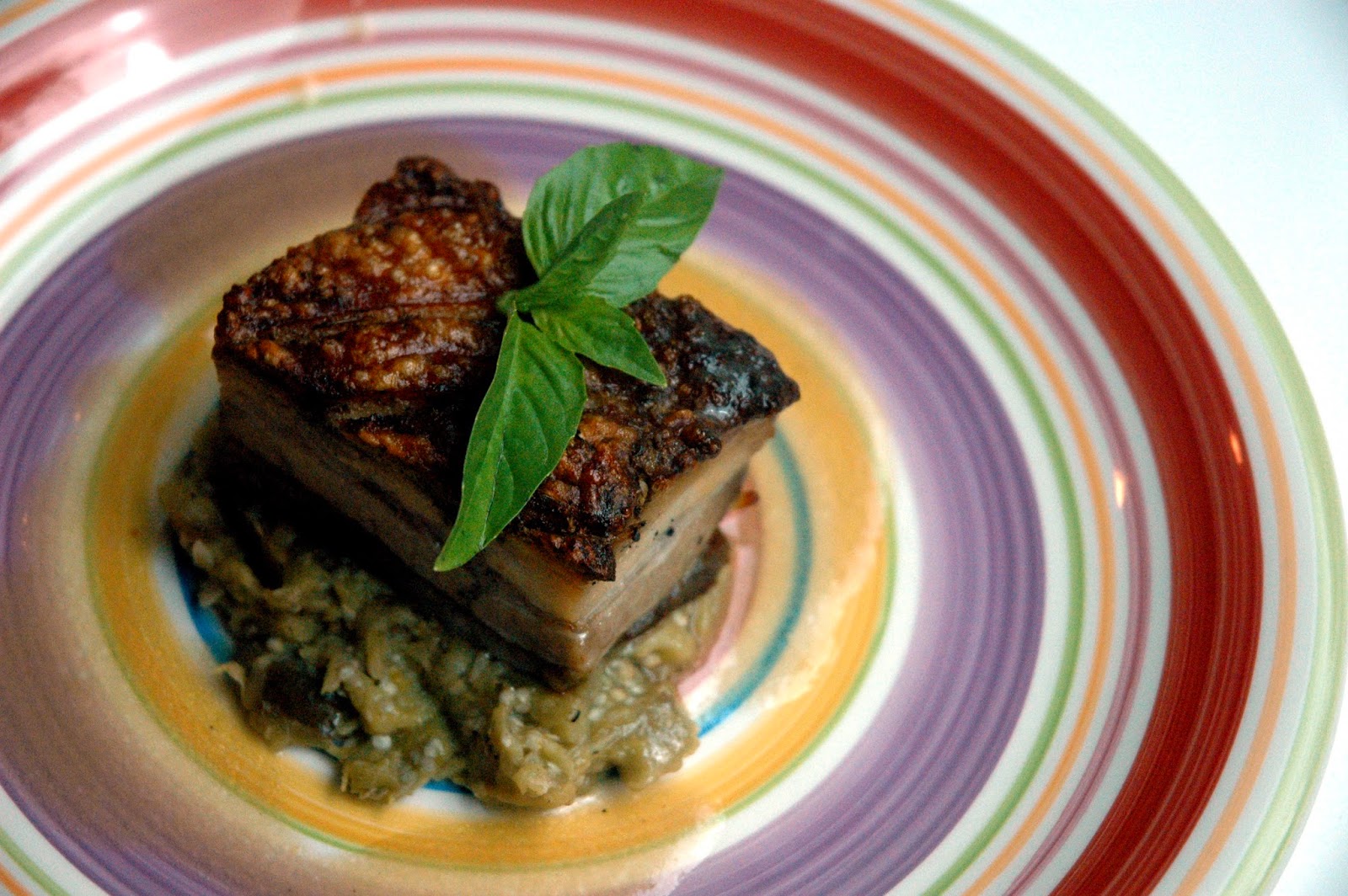 I used a regular knife, not even a carving knife, to gently slice a thick piece of the juicy pork belly, and the sound of crisp crackling whets your appetite even more. The pork belly is perfectly tender and juicy with a layer of light and crisp crackling, with buttery flavors. You don't need any sauce at all, this one's perfect as is. The smoky roasted eggplant mash provides creamy flavors complementing the richness of the pork. Extra garlic fried rice? Absolutely.