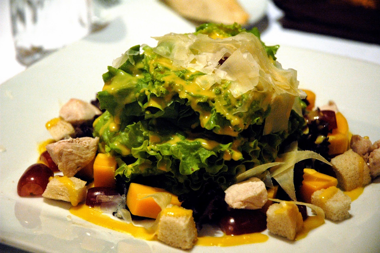 ...followed by the Traditional Caesar Salad (P 300), with crisp romaine lettuce, bacon, croutons and shards of Parmesan in that familiar and comforting dressing...