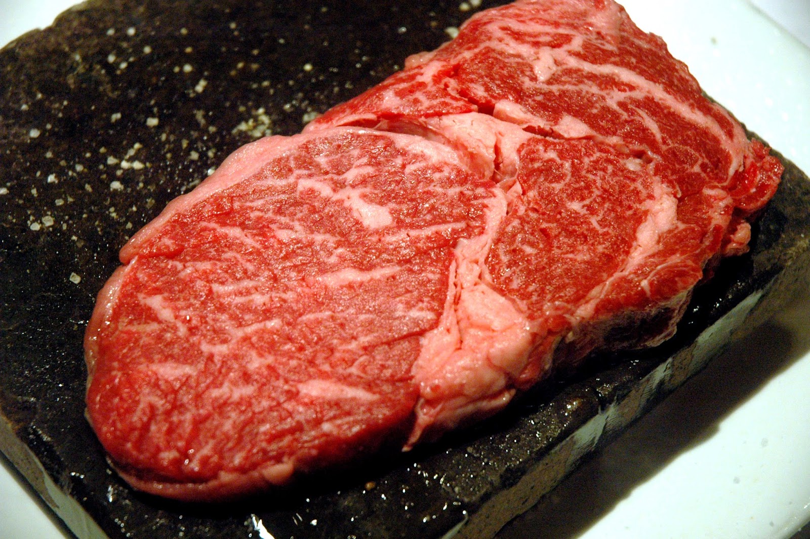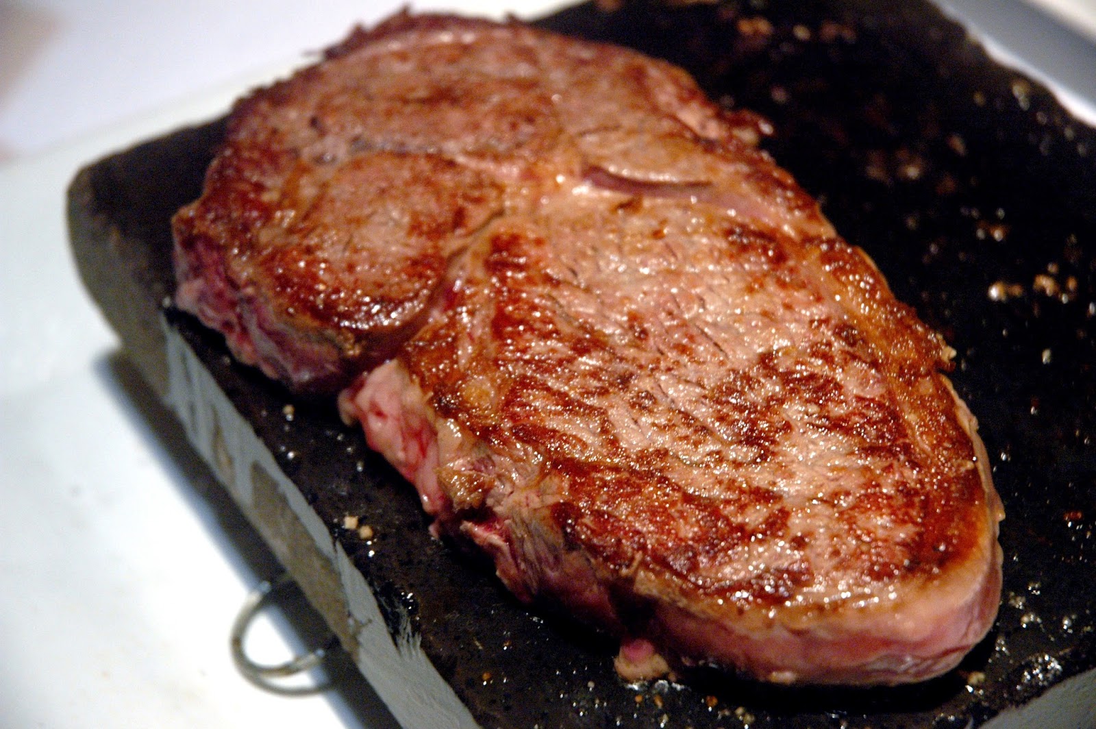 Finally, the ribeye is turned over. The hot stone does the job perfectly, with an even sear. Leave the steak for a few more minutes, and resist the temptation to turn it over again. Turn it over once and that's it.