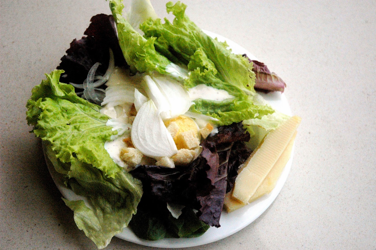 A refreshing salad, with crisp greens and a creamy blue cheese dressing topped with croutons and onions with a side of cheese kicks off my new plan of attack at Midas Cafe.
