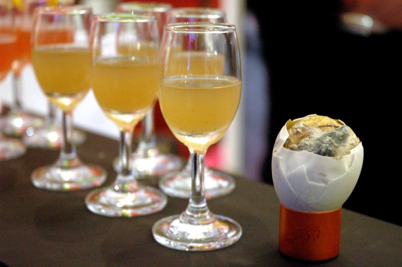Raffles Hotel's Long Bar's mixologist, and good buddy, Christian "Rian" Earl David S. Assidao and his classic take on the margarita, the Edouard's Margarita, an homage to Edouard-Jean Cointreau. Smooth and easy with crisp and clean flavors and fruity notes, and the subtle orange hint from Cointreau lingers long after the first sip. Rian's second cocktail, the playful and inventive Hatch from 1875, in reference to the year the first bottles of Cointreau were sold commercially, has noticeably and intentionally sharper flavors for contrast when paired with the local balut. Different, unique, a winning pair.