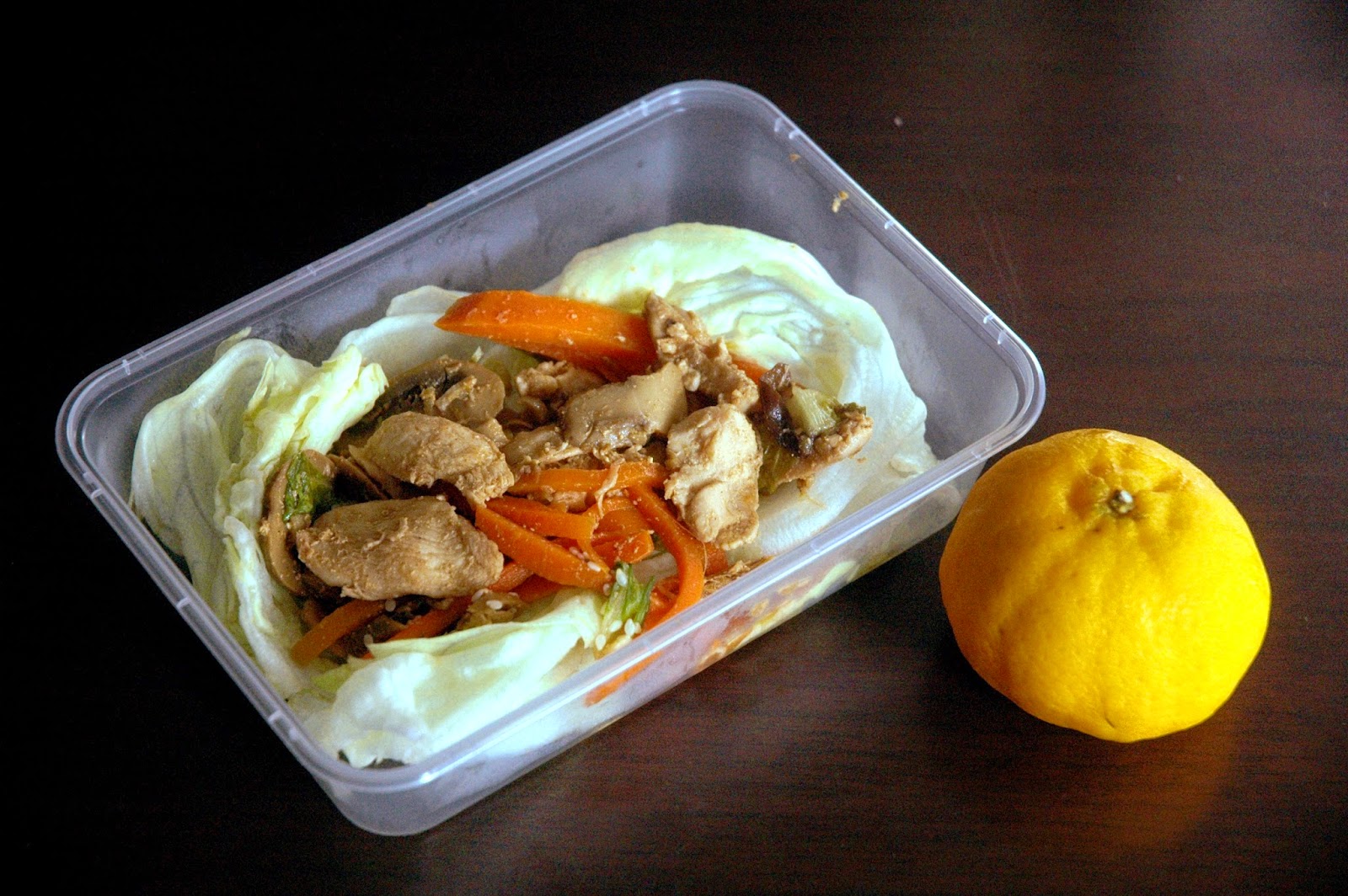 Day 2: Lunch. A light yet filling lunch with Yummy Diet's Lettuce Bowl with Mushroom and Hoisin Shredded Chicken and an orange, with tender chicken and fresh lettuce. The contrasting textures of the juicy chicken and crisp lettuce combine for a flavorful lunch, with the light hoisin sauce adding more flavor. Simply roll up and fold your chicken-stuffed lettuce and take a big bite. End your meal with an orange...nice.