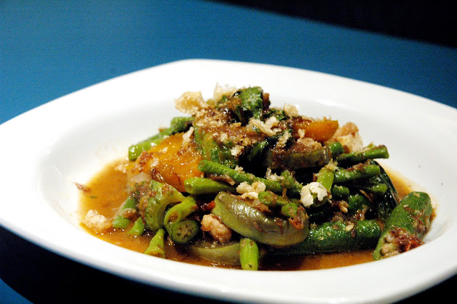 Pinakbet (P 135), a traditional vegetable dish with squash, eggplant, string beans, and bitter melon sauteed in shrimp paste and topped with pork cracklings, another traditional side dish to complement the mains at Smokin' Hot BarBQ. The fresh vegetables remain crisp, and the pork cracklings add a layer of flavor and texture to the vegetable dish.