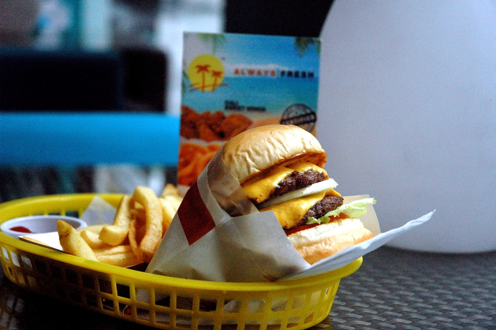 Caluburger's Cali Double Meal (P 375), with a pair of 100% lean all-beef patties topped with melted real American cheese, fresh tomatoes, and crisp iceberg lettuce on a soft and freshly baked bun, served with fries and your choice of beverage. Add some raw onions for that extra kick in flavor, and you have one serious burger. You also have the option to add sauteed onions for that mild nutty flavor, but there's nothing like the bite of raw onions for that extra punch to balance the richness of the beef and cheese.