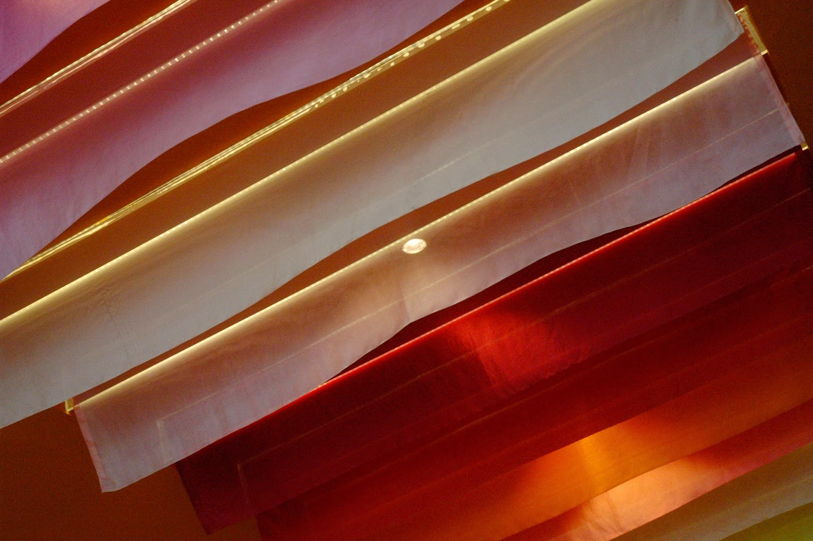 The bright colors of the interiors are accentuated by a playful wall display featuring colorful spools of thread in one corner, a visual cue to the colorful flavors of Korean cuisine served at O'Rice.