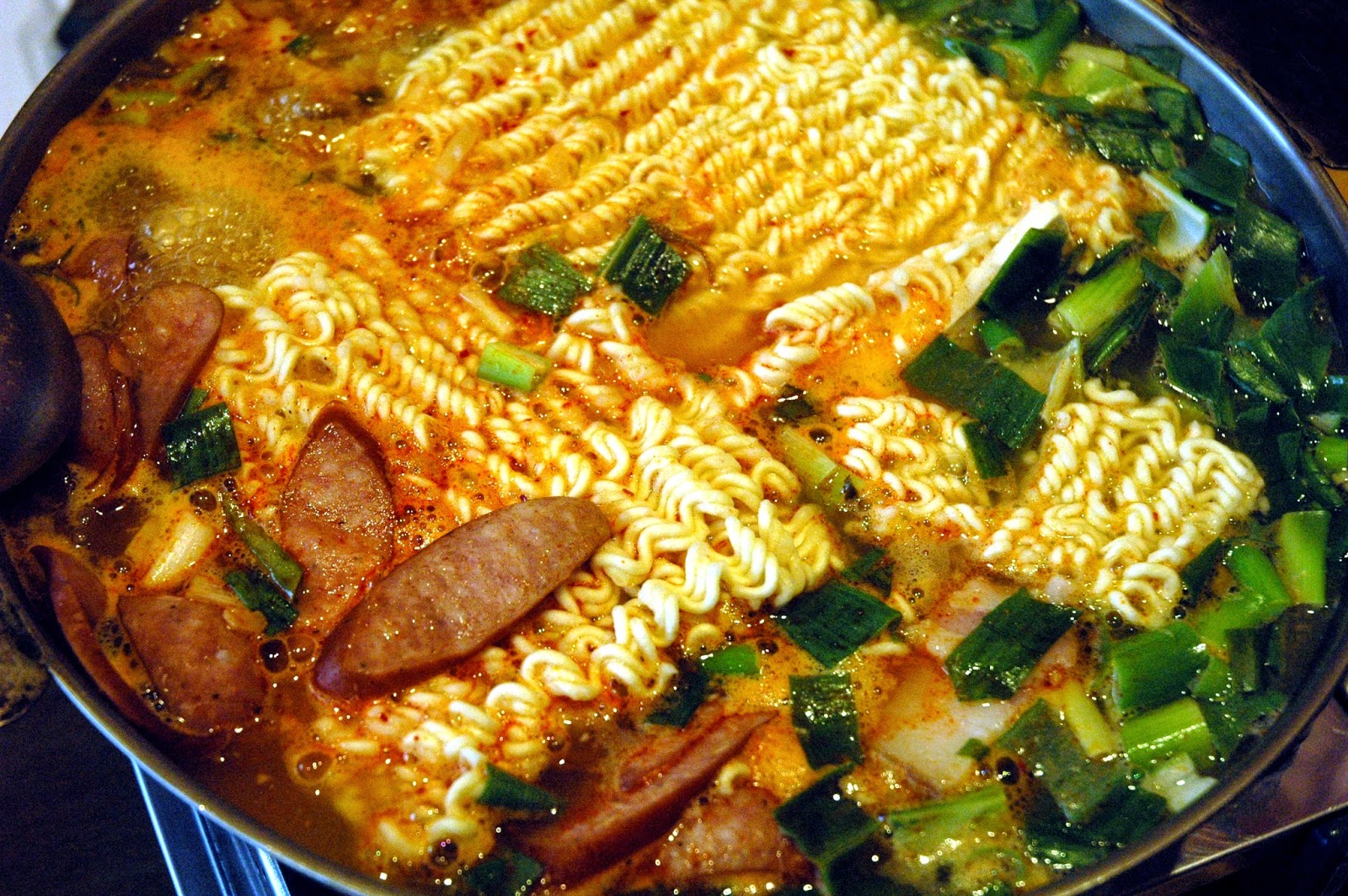 After a few minutes on the burner, the stew slowly transforms from a pale milky color to a bright red broth, as the vegetables and spices enrich the stew along with the various western-style meats. The first sensation you experience is the soothing heat of the thick spiced broth, but layers of different notes from the various ingredients come into play shortly after, combining for a rich blend of flavors. This unique dish has that familiar spicy note one can find in many Korean dishes, but the mix of ingredients, including bacon, macaroni, sausages, and tofu, make it different. Perfect for a hangover, or a cold or rainy day. Or any day, really.