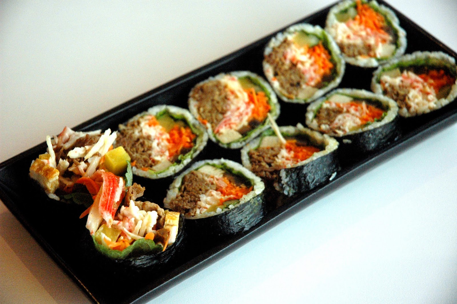 Beef Bulgogi Kimbap (P 298), bulgogi with a twist, with the signature Beef Bulgogi wrapped in steamed rice and seaweed with fresh vegetables. This traditional Korean dish was inspired by the Japanese futomaki, but unlike the Japanese version which uses vinegared rice, the Korean adaptation uses sesame oil for nuttier flavors. Classic finger food, with a blend of rich flavors. Other options include Shrimp, Spicy Pork, and Tuna Kimbap.