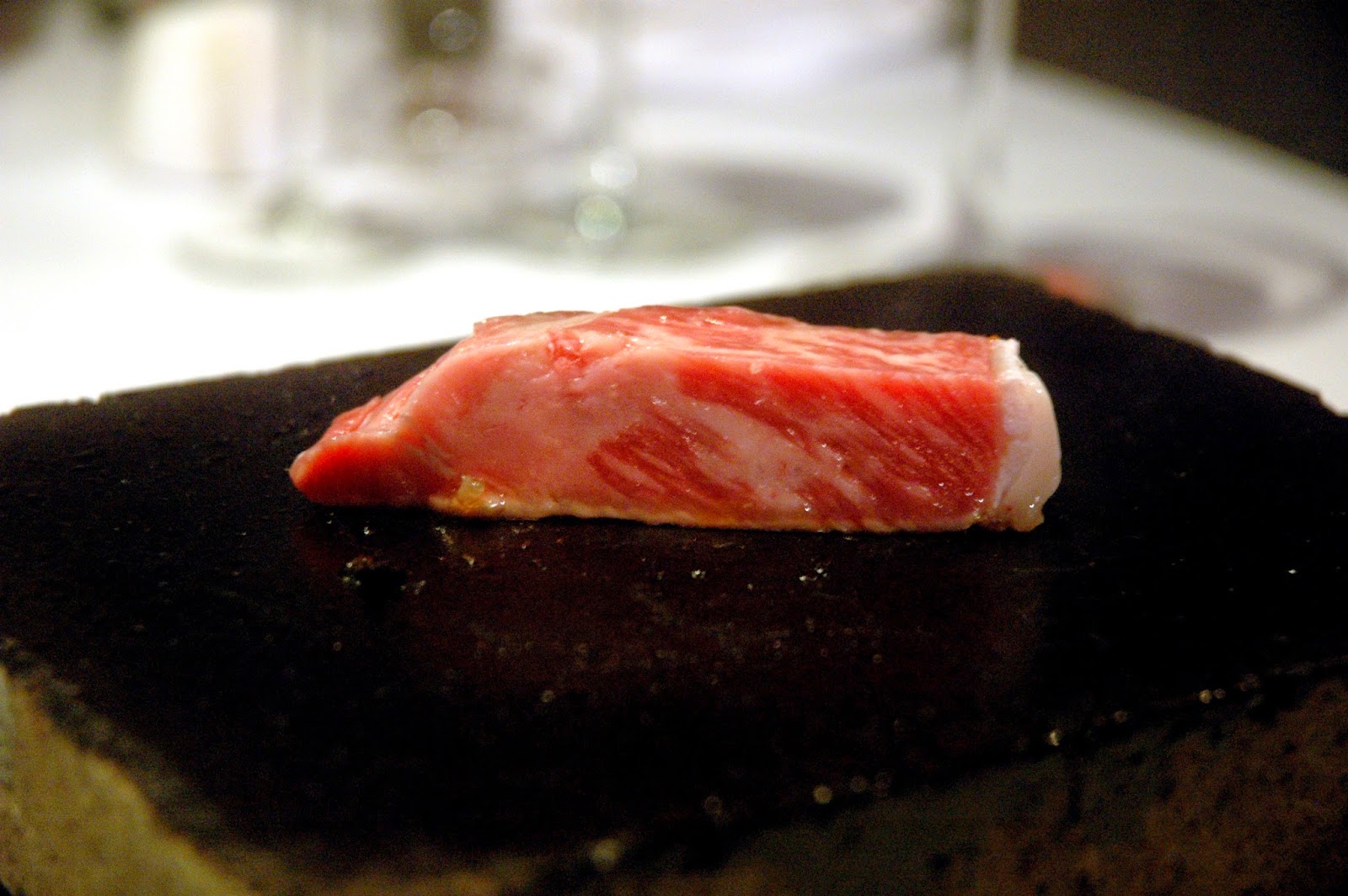 Authentic pure breed Wagyu is known the world over for its texture, flavor, and aroma. The melt in your mouth texture and the rich flavors are the immediate and most noticeable characteristics of pure breed Japanese Black cattle, but it's the aroma that elevates it from the rest. The subtle aroma releases delicate notes reminiscent of sweet peaches and coconuts that intensifies as you chew the buttery beef. The aroma is released at a certain temperature, stays in the meat, and released once more when chewed adding to the richness in flavor. Quality is ensured by a meticulous grading system by the Japanese Meat Grading Association, based on meat quality grade, ranging from 1 to 5 depending on marbling, meat color and shine, firmness, and texture; and yield grade, with "A" as above average and "C" as the lowest. Based on the criteria, experiencing A5 grade Wagyu represents the highest standard in Japanese Wagyu. Marbling is also given a scale, from 1 (almost lean) to 12 (perfectly marbled), and this is evident in the intensity of the fine white specks on the meat. That evening, we had the rare opportunity to experience A5 Prime Wagyu with a marbling grade of 11 from the Saga Prefecture, both rare and as close to perfection as you can get.