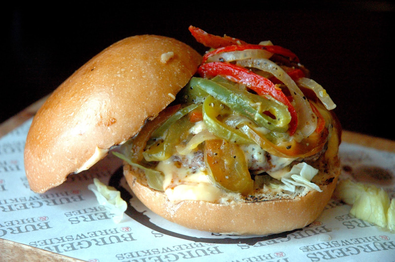 ...like the Philly (P 250), with the signature B&B beef patty stuffed with sauteed thinly sliced steak and B&B cheese sauce, topped with sauteed onions and peppers. A Philly cheese steak inside a burger, now how cool is that? The sauteed onions and peppers add familiar flavors you find in a cheese steak, recreated in a burger. But check out what these guys do with fish...