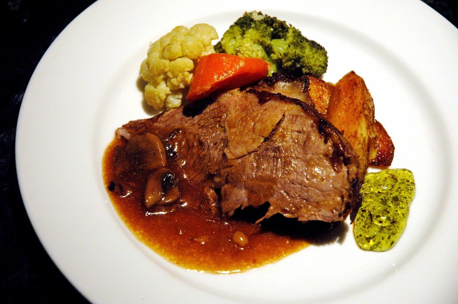 But save room for some premium protein from the Marriott Cafe's Carving Station. Roast Leg of Lamb with buttered vegetables and potato wedges, with mushroom gravy and a side of mint jelly, elegantly plated by the chefs on station. The lamb is tender, with just enough bite for texture, with rich flavors.