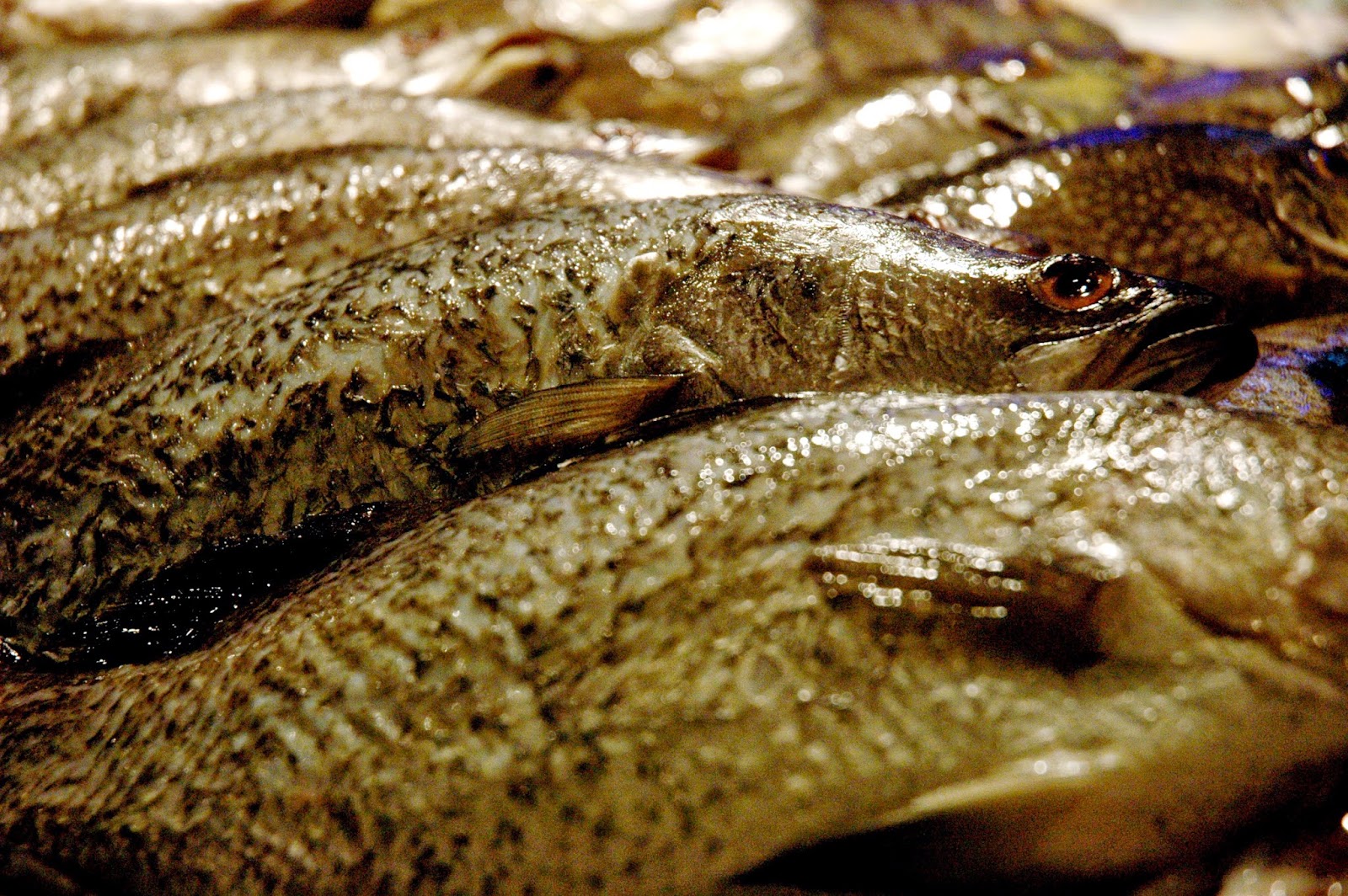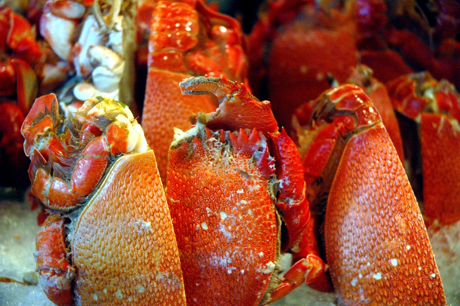 Above the spread of various ceviche preparations is another equally impressive selection of fresh shellfish, including clams and mussels on ice...