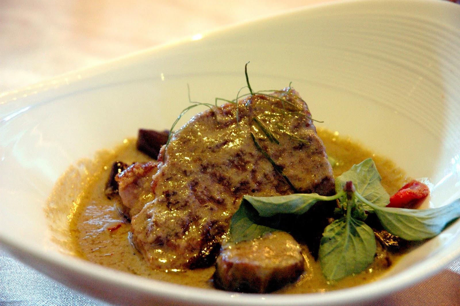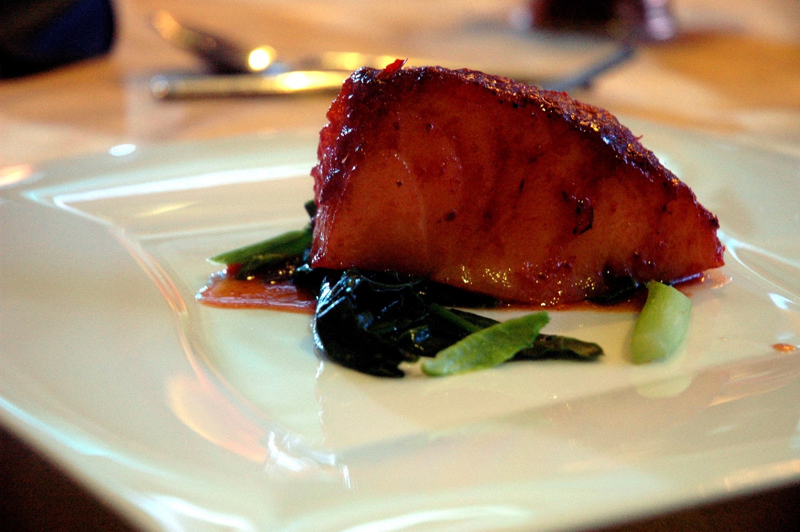 The first of the mains were then served, a delicate Chili Glazed Chilean Sea Bass, with the soft, white and tender fillet rubbed with house-blended chili paste. The noticeable sharpness of the chili glaze adds a distinct and lingering heat without overwhelming the delicate Chilean sea bass, or the palate. The bold notes of the chili glaze are tempered and balanced in another masterful weave of contrasting flavors.