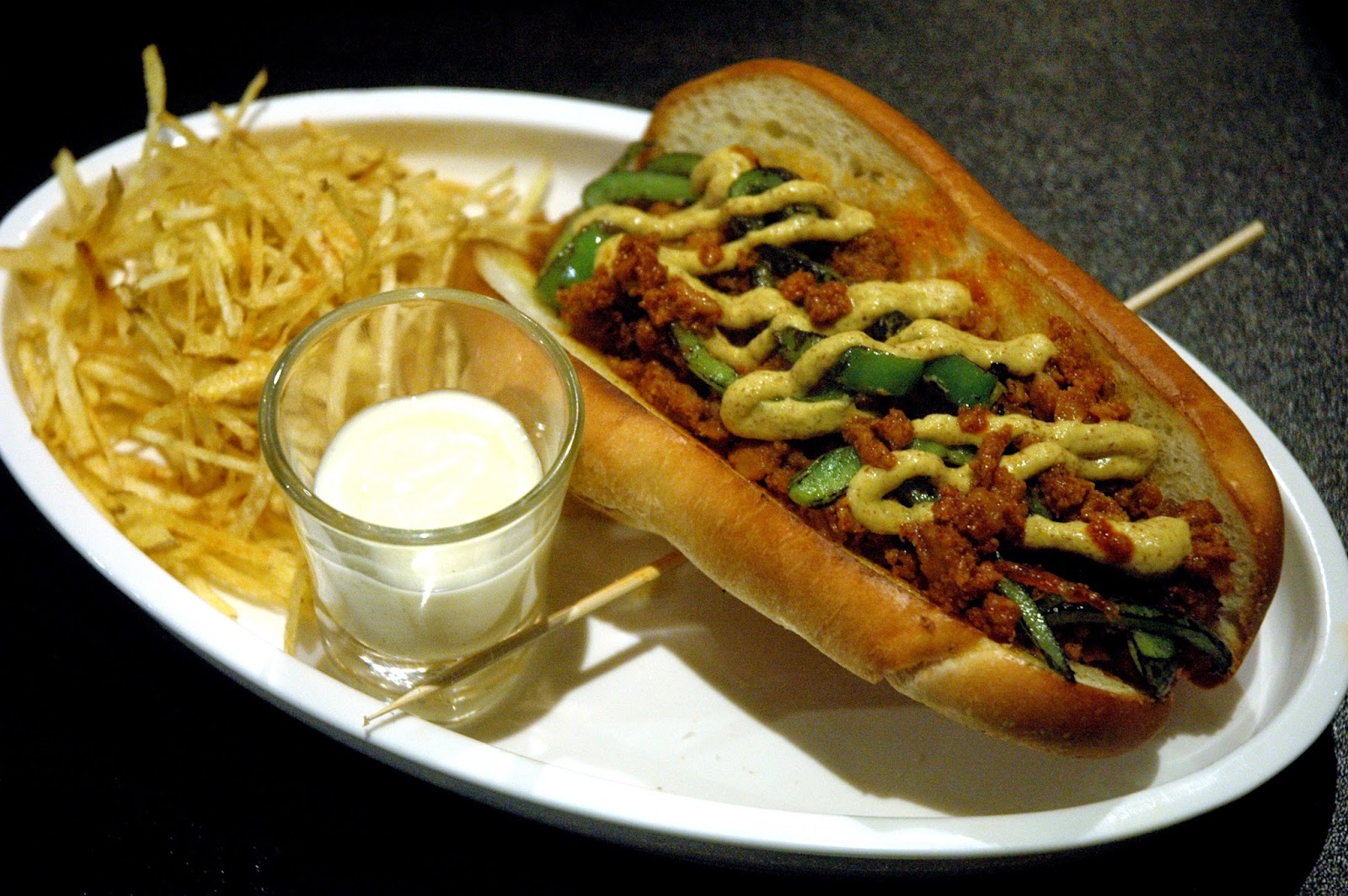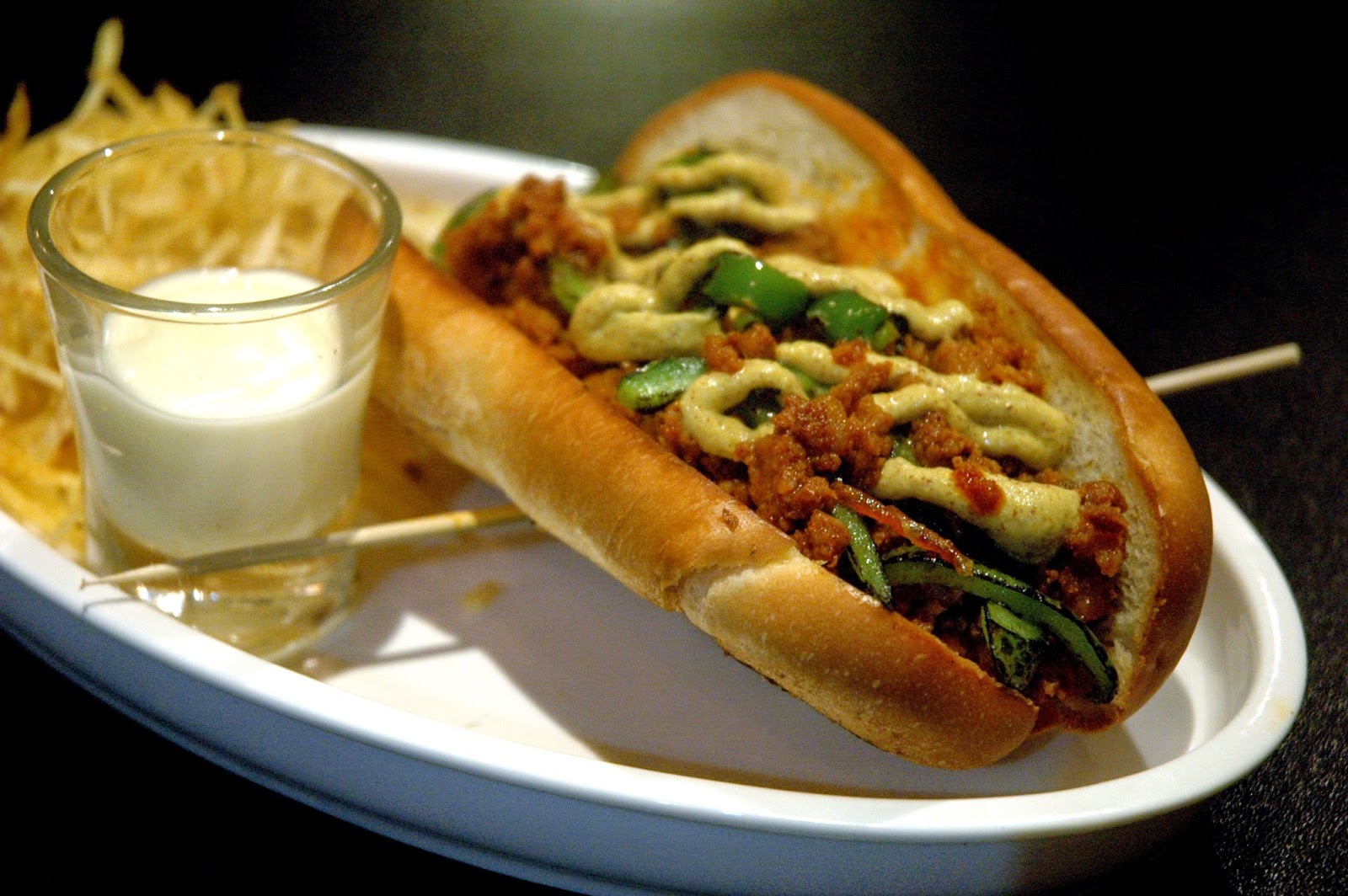 And here's a cool dog with a flavorful attitude, the Chorizo Dog (P 350), a hefty sausage link topped with fire roasted peppers and hot mustard on a soft brioche bun, served with a side of Tipple & Slaw's signature fires. The sharp notes of the chorizo add that distinct layer of bold flavors, perfectly complemented by the smoky roasted peppers and that burn and bite from the hot mustard. The snap of the sausage, and the different toppings combine for one perfectly cool dog.