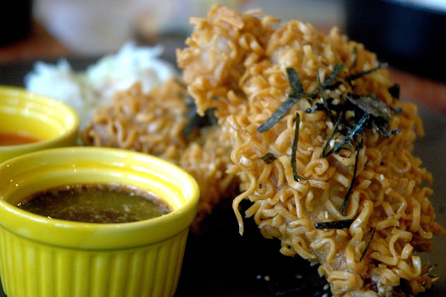 A closer look at the perfectly crisp chicken reveals the delicate noodle coating, adding even more crunch with every bite. The spicy Sriracha vinegar dip cuts the richness of the chicken, with its soothing layer of heat. It's familiar yet new and different, and a tasty preview from the creative duo of Chef Miko Aspiras and Kristine Lotilla.