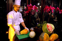 In one corner of Spices, a master chef displays his skill and artistry with elaborate fruit carvings. Each piece is intricately carved, with each cut and groove revealing colors and depth. A papaya, pumpkin, and watermelon are quickly transformed into pieces of edible art.