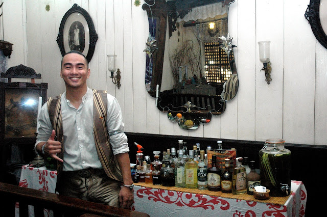 To complete the impression of going back in time, Kalel Demetrio uses old pharmaceutical style apothecary bottles with corks for his presentation of exclusive cocktails created for Salo sa Taal.