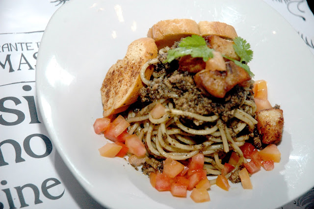 The creative inventiveness of Pia Y Damaso is showcased with its Tuna Egg (Bihod) with Tapenade, Seared Blue Marlin, and Fresh Tomatoes (P 360), another unique dish with rich tuna egg roe, caramelized onions, garlic, black olives, sardines, tomatoes, olive oil, and seared blue marlin chunks. It's another flavor combination that challenges the norm, blending the best of local flavors, in one elegantly executed dish. Each noodle is coated with the rich tuna egg roe, punctuated by the tart tomatoes, the sharpness of the black olives and sardines, rounded out by the rich and nutty flavors of the olive oil capped by the tender and delicate notes of the seared blue marlin. I;m pretty sure the young idealistic students described by Jose Rizal in Macau "Good Taste" Restaurant would have enthusiastically praised this dish as they did the Lang-Lang. And why not, the combination is definitely new and different, matching the subversive culinary theme of Pia Y Damaso.