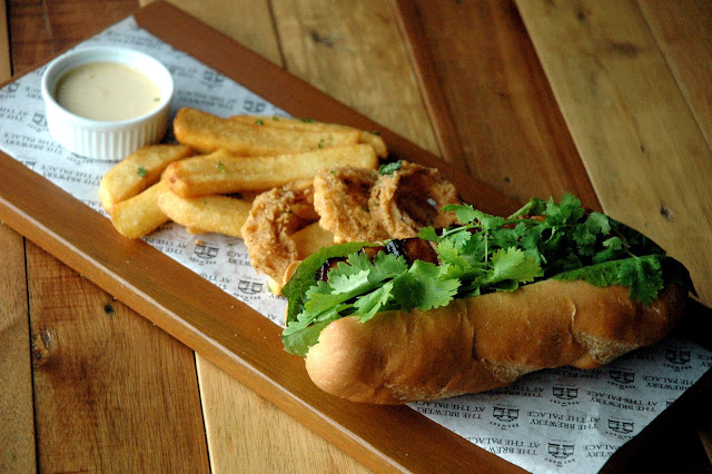 The Banh Mi (P 330), a Vietnamese style bbq pork belly, house-pickled vegetable relish, and fresh coriander on a crispy baguette, represents the diversity of flavors offered at The Brewery. The richness of the tender pork belly with its sweet bbq glaze is tempered by the subtle yet sharp lemony and citrus notes of the fresh coriander for balanced flavors.