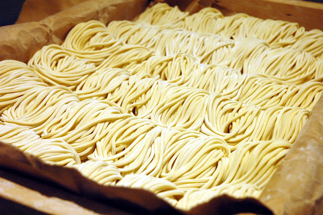 The wooden trays are then prepared, ready for the fresh batch of noodles for the dinner service.