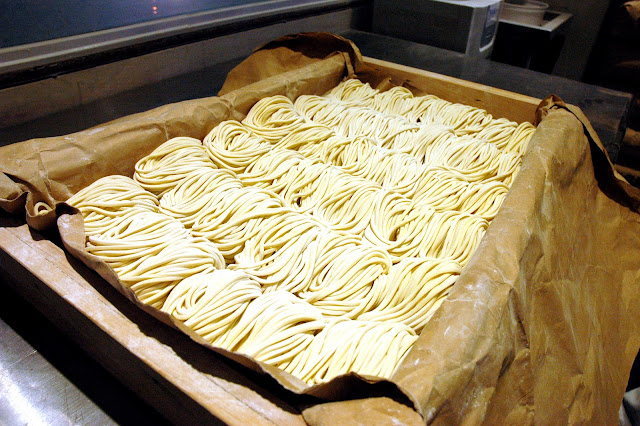 The freshly made noodles are then neatly arranged on flour dusted, paper lined wooden trays, ready to be sent to Mitsuyado's kitchen, all fired up and ready for dinner and the incoming customers.