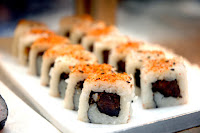 At the Sushi and Sashimi Station, the chef plated a selection of fresh and premium Mackerel with thinly sliced lemon, Hamachi, or Japanese amberjack, Salmon, and Tuna topped with ebiko on a bed of thinly shredded radish and carrots.