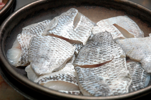 ...and fresh fish, grilled on a flat hot grill. Other selections include fresh shrimps, squid, and vegetables as well as noodles for that perfect teppanyaki plate.
