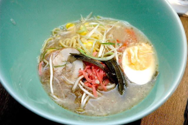 A bowl of Ramen, freshly prepared at the Japanese Ramen Station, is served steaming hot, with a rich pork broth topped with firm and chewy noodles, fresh vegetables, sweet corn, pickled vegetables, nori, a soft boiled egg and thin slices of pork chasiu. Comforting and flavorful, this one hits the spot.