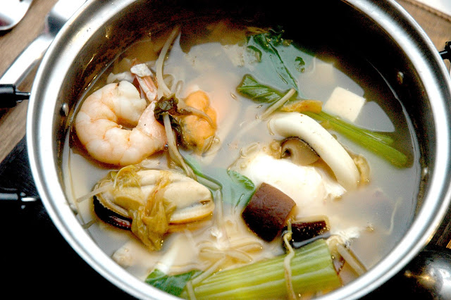 I kick-off my North Asian Showdown at Marriott Cafe's Korean Hot Pot Station, starting with a light and steaming hot seafood broth, some fresh greens and vegetables, a little kimchi for some heat, and a load of the freshest seafood, including some fresh and plump scallops...
