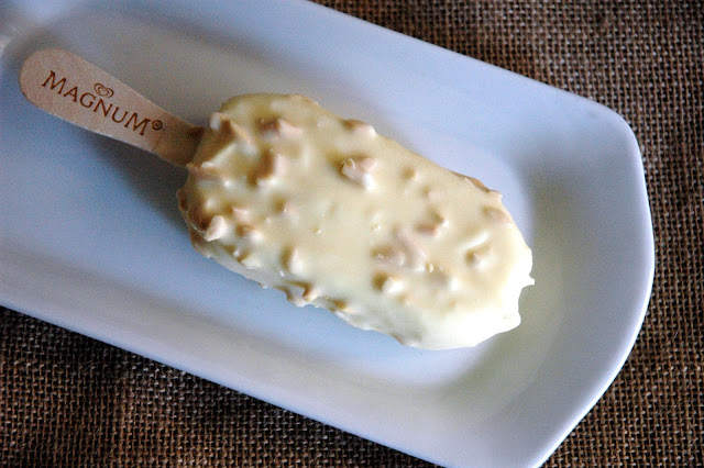 The signature rich and velvety smooth vanilla ice cream is now all dressed up in white, elegantly draped with thick white chocolate made from the finest Belgian chocolate, sprinkled with almonds for a whole new and indulgent flavor experience. Rich flavors and contrasting textures combine for the ultimate ice cream bar, and once again, Magnum's newest variant takes ice cream pleasure to a whole new level.